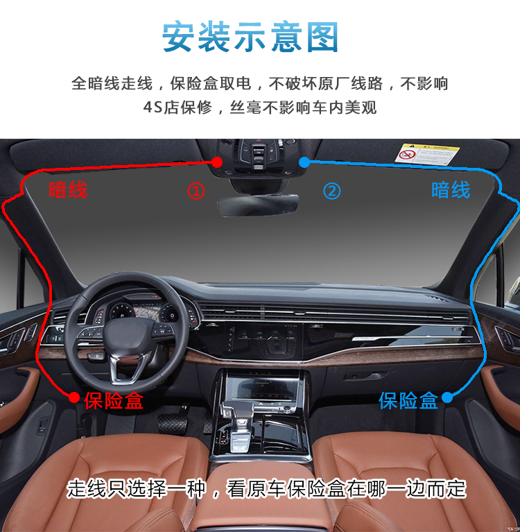 全暗線走線,保險盒取電,不破線,不打孔,絲毫不影響車內美觀和4S店保修,免去車主擔心愛車被拆壞的顧慮